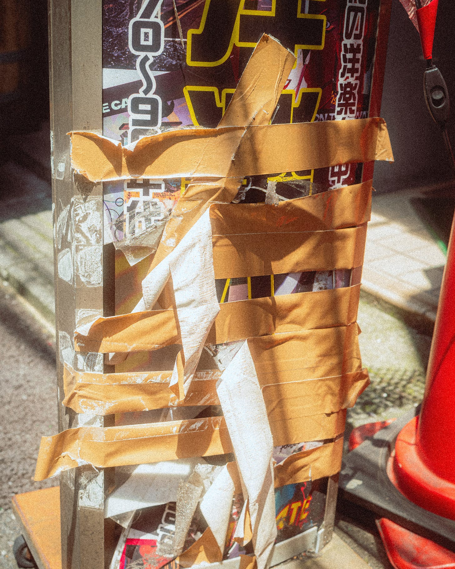 Now, I’m basically obsessed with finding these tapey textures. There’s an artistic element in them, or so I tell myself, which can tell different Tokyo stories. No neon. No Blade Runner. No cliché images or people in the intersection making weird faces as they walk by, just tape, rope, and hope.